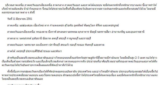 กรมอุตุฯ เตือนฝนตกต่อเนื่องกับมีฝนตกหนักบางแห่งบริเวณภาคเหนือ ภาคตะวันออกเฉียงเหนือ ภาคกลาง ภาคตะวันออก และภาคใต้ตอนบน ระวังน้ำท่วมฉับพลันน้ำป่าไหลหลาก