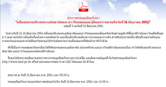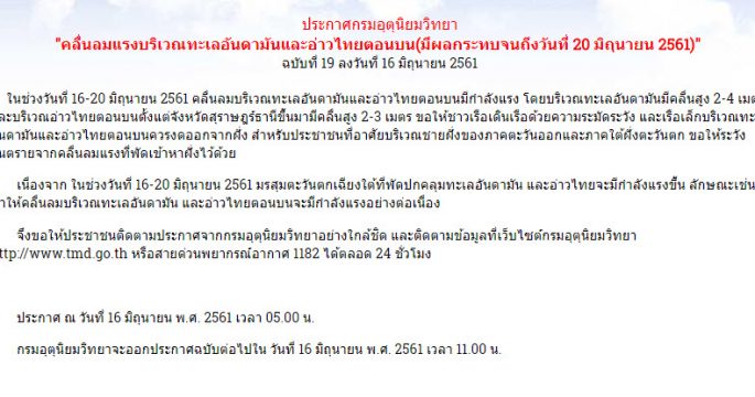 กรมอุตุฯ เผยไทยมีฝนลดลง แต่ยังมีฝนตกต่อเนื่องกับมีฝนตกหนักบางแห่งบริเวณภาคเหนือ ภาคตะวันออกเฉียงเหนือ ภาคกลาง ภาคตะวันออก และภาคใต้ ระวังน้ำท่วมฉับพลัน น้ำป่าหลาก ทะเลอันดามันและอ่าวไทยตอนบน คลื่นสูง 2-3 เมตร