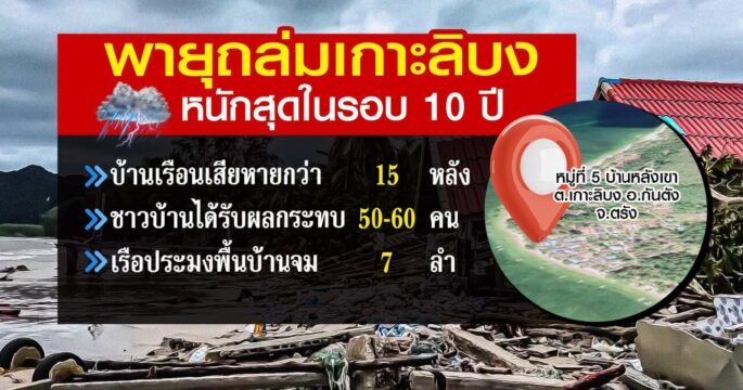 ชาวเกาะลิบงอ่วม พายุคลื่นลมแรง ทำเรือประมงพื้นบ้านล่ม 7 ลำ รีสอร์ต-บ้านเรือนประชาชน พังเสียหายหลายหลัง หนักสุดในรอบ 10 ปี
