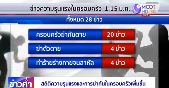 สถิติความรุนแรงและการฆ่ากันในครอบครัว ตลอดครึ่งเดือน ม.ค.ที่ผ่านมา พบมากขึ้นเฉลี่ย 3 ข่าวต่อวัน ล่าสุดมีผู้เสียชีวิตแล้ว 33 คน