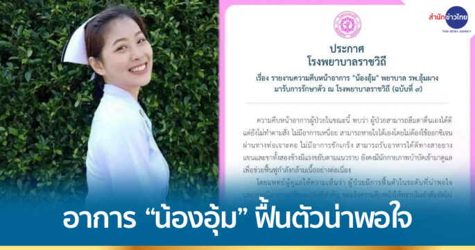 รพ.ราชวิถี รายงานความคืบหน้าอาการ “น้องอุ้ม” พยาบาล รพ.อุ้มผาง มีการฟื้นตัวในระดับที่น่าพอใจ ลืมตาตื่นเองได้ดี แต่ยังไม่ทำตามสั่ง หายใจได้เอง รับอาหารได้ดีทางสายยาง แขน-ขามีแรงขยับตามแนวราบ นักกายภาพช่วยฟื้นฟูกำลังกล้ามเนื้อต่อเนื่อง