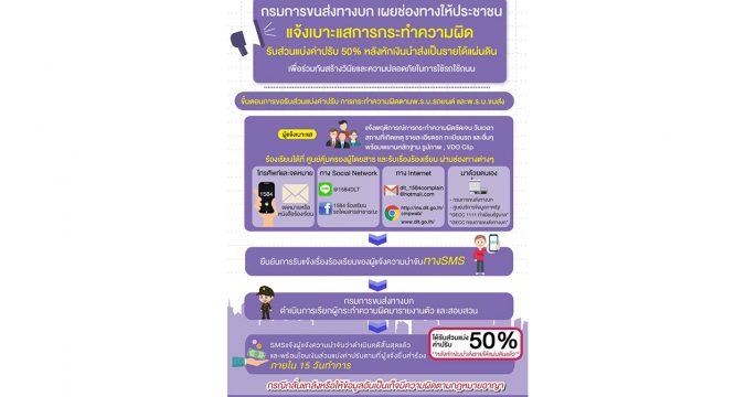 เริ่มแล้ว!! ช่องทางรับแจ้งเบาะแส การกระทำความผิดตามกฎหมายว่าด้วยรถยนต์และกฎหมายว่าด้วยการขนส่งทางบก รับส่วนแบ่งค่าปรับ 50% เพื่อร่วมกันสร้างวินัยและความปลอดภัยในการใช้รถใช้ถนน