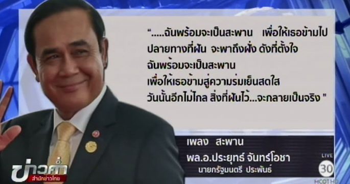 นายกรัฐมนตรี แต่งเพลงใหม่ชื่อเพลง “สะพาน” เพื่อสื่อความหมายเหมือนคณะรัฐมนตรีทำหน้าที่เป็นสะพาน เพื่อพาพี่น้องประชาชนก้าวข้ามภาวะลำบากสู่ความมั่นคง และยั่งยืน