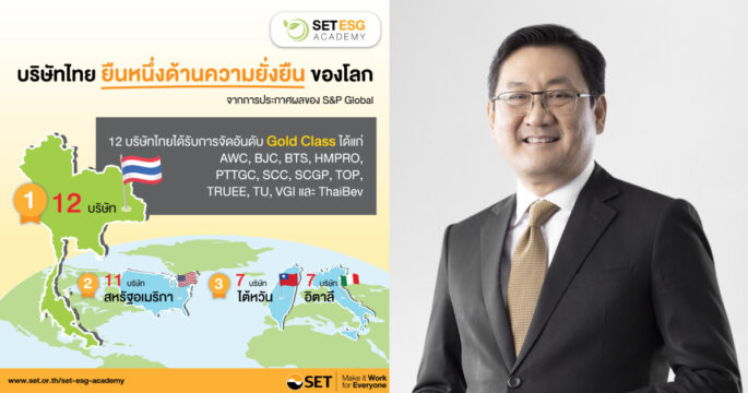 ตลท. เผย 12 บริษัทไทยติดอันดับความยั่งยืนใน The Sustainability Yearbook 2023 ในระดับ Gold Class จากการประกาศผลของ S&P Global มากที่สุดเป็นอันดับหนึ่งของโลก สะท้อนการเป็นผู้นำด้านความยั่งยืน ตอกย้ำความเชื่อมั่นนักลงทุน
