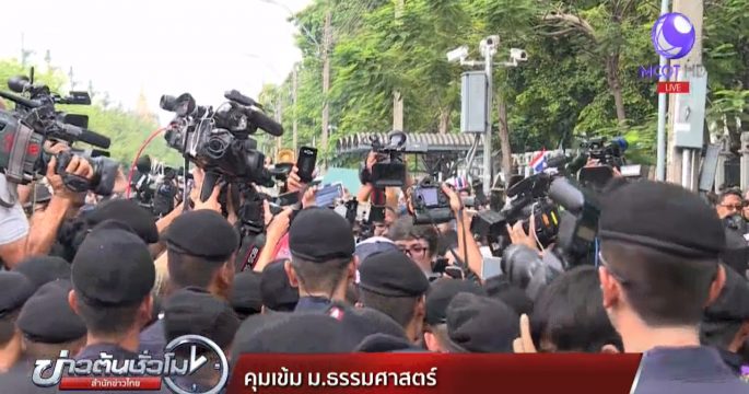 เจ้าหน้าที่ต้องกันพื้นที่ “กลุ่มคนอยากเลือกตั้ง” ที่ ม.ธรรมศาสตร์ ท่าพระจันทร์ พร้อมประกาศผ่านเครื่องขยายเสียงขอให้ผู้ชุมนุมอยู่ในความสงบ