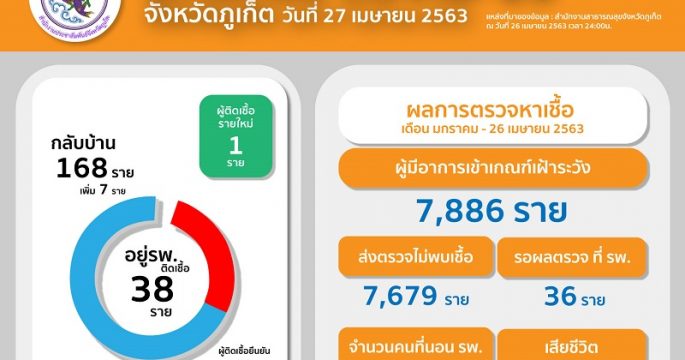 คณะกรรมการโรคติดต่อจังหวัดภูเก็ตรายงานโควิด-19 ในพื้นที่พบเพิ่ม 7 ราย ป่วยสะสม 214 ราย เสียชีวิตเป็นรายที่ 2 สาธารณสุขจังหวัดระบุสถานการณ์ระบาดในพื้นที่แนวโน้มเริ่มดี พบผู้ป่วยรายใหม่น้อยลง และการรักษาหายเพิ่มขึ้นเป็นลำดับ
