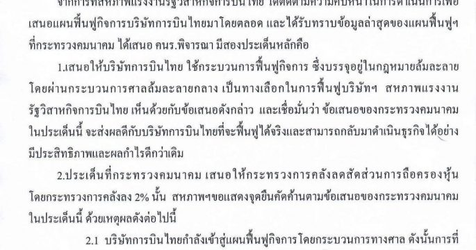 สหภาพฯ การบินไทยออกแถลงการณ์คัดค้านคลังลดถือหุ้น ทำพ้นสภาพรัฐวิสาหกิจ