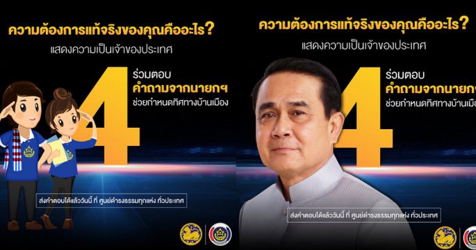 มหาดไทย 16 มิ.ย.- กรมการพัฒนาชุมชน โดยกระทรวงมหาดไทย ได้จัดกิจกรรมเชิญชวนประชาชนร่วมตอบคำถาม 4 ข้อ ของพล.อ.ประยุทธ์ จันทร์โอชา นายกรัฐมนตรี ที่ตลาดคลองผดุงกรุงเกษม ทำเนียบรัฐบาล โดยประสานให้เจ้าหน้าที่ศูนย์ดำรงธรรมมาอำนวยความสะดวก นอกจากนี้ ยังมีการจัดทำภาพอินโฟกราฟฟิค 2 ภาพ เพื่อเผยแพร่ โดยภาพแรกเป็นภาพของ พล.อ.ประยุทธ์ และอีกภาพเป็นตัวการ์ตูน ซึ่งทั้ง 2 ภาพระบุข้อความว่า “ความต้องการของคุณคืออะไร? แสดงความเป็นเจ้าของประเทศ ร่วมตอบคำถามจากนายกฯ ช่วยกำหนดทิศทางบ้านเมือง” .- สำนักข่าวไทย