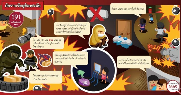 สพฉ.ออกคำเตือน แนะประชาชนหากพบเห็นวัตถุต้องสงสัย ให้รีบโทรแจ้ง 191 ห้ามแตะต้องหรือเคลื่อนย้ายด้วยตนเองอย่างเด็ดขาด