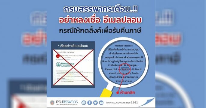 กรมสรรพากร เตือนอย่าหลงเชื่ออีเมลปลอมการแจ้งคืนภาษี หากมีข้อสงสัยสามารถสอบถามรายละเอียดเพิ่มเติมได้ที่สำนักงานสรรพากรทุกแห่งทั่วประเทศ หรือศูนย์สารนิเทศสรรพากร โทร. 1161