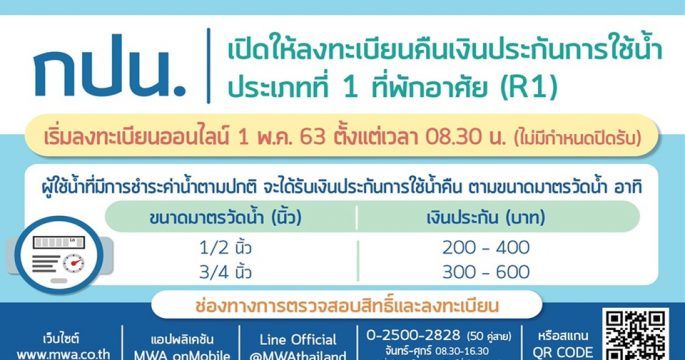 กปน.เปิดลงทะเบียนคืนเงินประกันการใช้น้ำประเภทที่พักอาศัย (R1) 1 พ.ค. วงเงิน 200-600 บาท เริ่มคืนเงิน 15 พ.ค.นี้
