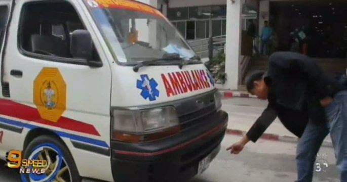 เจ้าหน้าที่ก็ภัยชี้ให้ดูรอยกระสุน ที่ถูกวัยรุ่นเชียงรายยิงใส่รถเสียหาย และเจ้าหน้าที่กู้ภัยเจ็บ 3 คน ในจำนวนนี้อาการสาหัส 1 คน