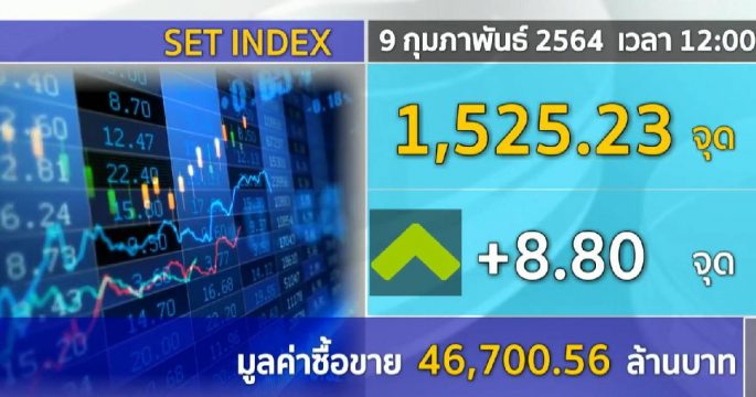 หุ้นไทยภาคเช้าปรับตัวขึ้น 8.80 จุด อยู่ที่ 1,525.23 จุด มูลค่าการซื้อขาย 46,700.56 ล้านบาท เคลื่อนไหวตามแรงหนุนดัชนีหุ้นทั่วโลก