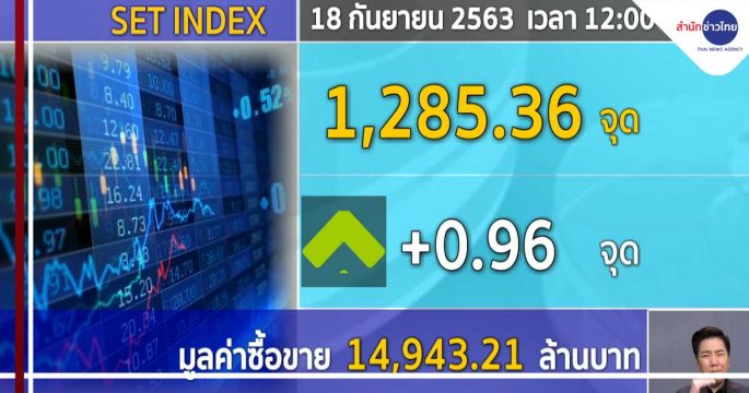 18 ก.ย. – ตลาดหุ้นไทยในภาคเช้า ดัชนีแกว่งตัวแคบ ๆ ในแดนบวก ตลาดยังขาดปัจจัยใหม่เข้ามากระตุ้นการลงทุน ขณะที่นักลงทุนรอดูการชุมนุมทางการเมืองในช่วงสุดสัปดาห์นี้ ดัชนีอยู่ที่ 1,285.36 จุด บวก 0.96 มูลค่าซื้อขาย 14,943.21 ล้านบาท ด้านเงินบาท เปิดตลาดที่ 31.13 บาทต่อดอลลาร์สหรัฐ แข็งค่าขึ้นเล็กน้อย ตลาดจับตาการชุมนุมทางการเมืองเช่นกัน ขณะที่ ราคาทองคำ เพิ่มขึ้น 100 บาท ทองแท่งขายออก บาทละ 28,800 บาท ทองรูปพรรณ ขายออกบาทละ 29,300 บาท .- สำนักข่าวไทย