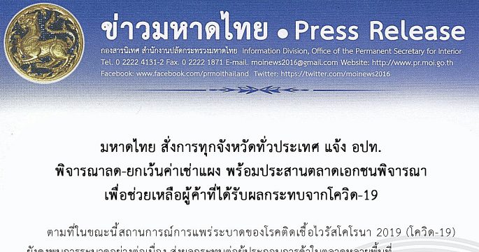 มหาดไทยสั่งการทุกจังหวัดแจ้งอปท.ประสานตลาดเอกชนพิจารณาลด-ยกเว้นค่าเช่าแผง ช่วยผู้ค้าที่ได้รับผลกระทบจากโควิด-19