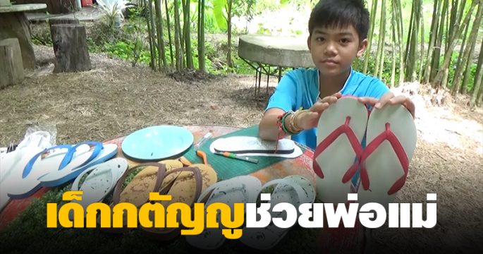 เด็กชายวัย 11 ปี ใช้เวลาว่างช่วงปิดเทอมนั่งแกะลายรองเท้าฟองน้ำ หรือ รองเท้าแตะตามแบบที่ถอดมาจากยูทูบ เพื่อขาย นำเงินไปซื้อเสื้อผ้าชุดนักเรียน และอุปกรณ์การเรียนเพื่อแบ่งเบาภาระค่าใช้จ่ายของครอบครัว