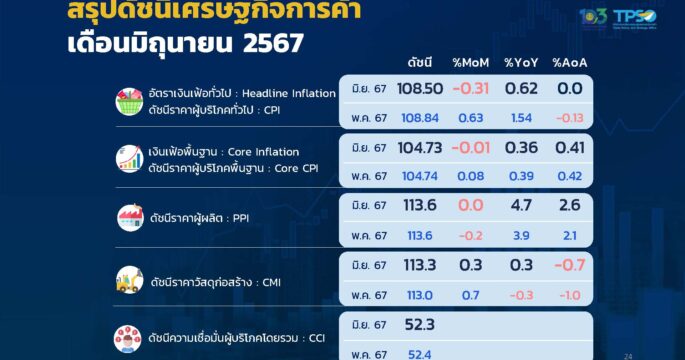 สนค.เผยเงินเฟ้อเดือนมิถุนายน 2567 สูงขึ้นในอัตราชะลอตัวที่ 0.62% จากผลกระทบค่าไฟฟ้า ราคาอาหารสดสูงขึ้น แต่ยังต่ำเป็นอันดับ 2 ในอาเซียน 8 ประเทศ ขณะที่เงินเฟ้อทั้งประเทศยังคง 0.5% ส่วนแนวโน้มไตรมาส 3 คาดทรงตัว