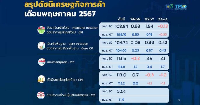 ดัชนีราคาผู้บริโภค พ.ค.67 อยู่ที่ 108.8 ส่งผลอัตราเงินเฟ้อสูงขึ้น 1.54% (YoY) เหตุค่าไฟ-พลังงาน-ผักสด-ไขไก่ แพงขึ้น คาดกรอบเงินเฟ้อทั้งปี อยู่ที่ 0.0-1.0% ขณะที่ดัชนีเชื่อมั่นผู้บริโภคอยู่ที่ 52.4 ปรับเพิ่มขึ้นเดือนแรกหลังลดต่อเนื่อง 6 เดือน