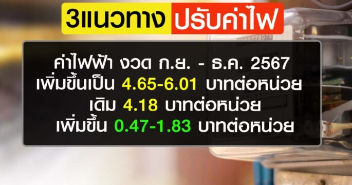 กกพ.เปิด 3 ทางเลือกค่าไฟงวด พ.ค.-ส.ค.67 ต่ำสุดเฉลี่ย 4.18 บาท/หน่วย