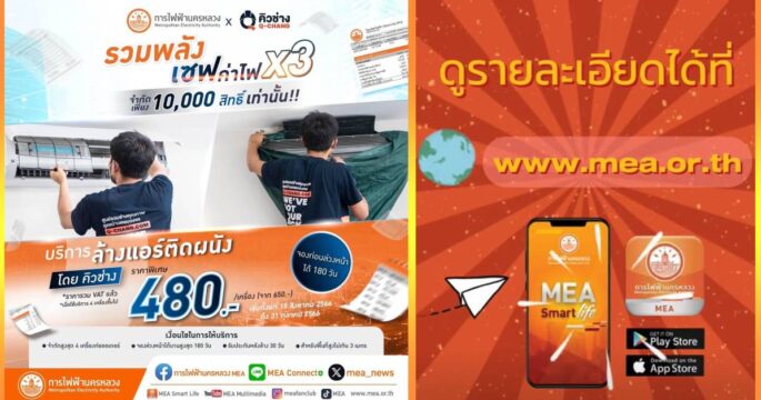 ข่าวดี! MEA x Q-CHANG (คิวช่าง) “รวมพลัง เซฟค่าไฟ X3” มอบส่วนลดล้างแอร์ราคาพิเศษ 10,000 สิทธิ์ต่อเดือน สำหรับผู้ใช้ไฟฟ้า MEA ที่อยู่ในจังหวัดกรุงเทพมหานคร นนทบุรี และสมุทรปราการ