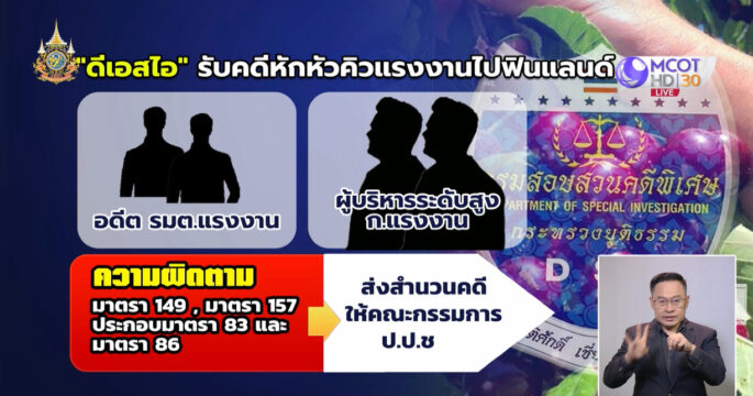 ดีเอสไอ มีมติกล่าวหาอดีตรัฐมนตรี และผู้บริหารระดับสูง กระทรวงแรงงาน ในความผิดต่อตำแหน่งหน้าที่ หลังพบหลักฐานพัวพันหักค่าหัวคิวส่งแรงงานไปฟินแลนด์ ความเสียหายรวม 36 ล้านบาท