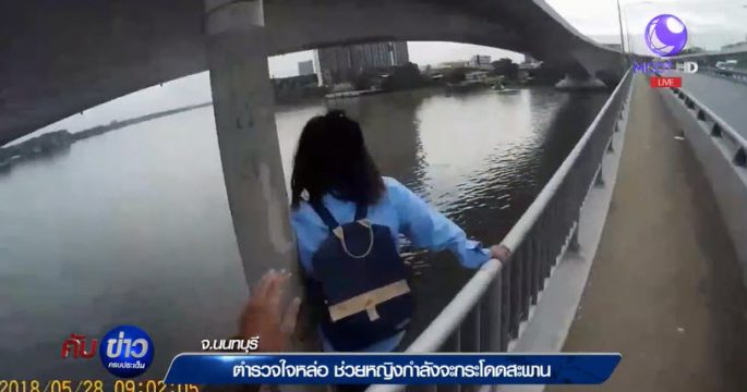 คลิปจับภาพชัด ตำรวจใจหล่อวิ่งข้ามถนนช่วยหญิงกำลังจะกระโดดน้ำเจ้าพระยา หวังฆ่าตัวตาย