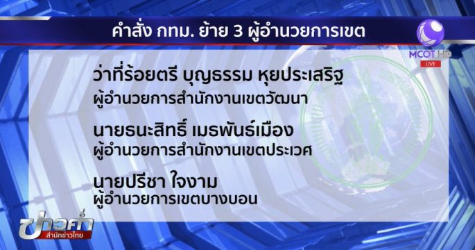 ปลัด กทม.มีคำสั่งให้ 3 ผอ.เขตช่วยราชการในสำนักปลัด กทม. จนกว่าจะมีคำสั่งเปลี่ยนแปลง เหตุจัดงานพระราชพิธีฯ ไม่เรียบร้อย