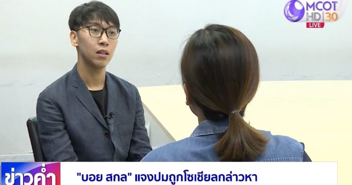 “บอย สกล” หรือ นายสกล เอี่ยมสอาด หนุ่มที่ถูกโซเชียลกล่าวหาว่าแอบอ้างเรียนมหาวิทยาลัยชื่อดัง ตีเนียนถือป้ายในงานฟุตบอลประเพณี และโกงเงินรุ่นน้อง ให้สัมภาษณ์กับสำนักข่าวไทย เคลียร์ทุกปมร้อน ก่อนเข้าแจ้งความที่ สน.บางรัก 31 ต.ค.นี้