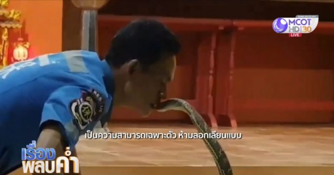 หน่วยกู้ภัยจับงูจงอางยาวเกือบ 4 เมตร ที่เลื้อยเข้าบ้านใน ต.เขาคราม จ.กระบี่ แต่ระหว่างนำกลับมาที่ศูนย์ งูเกิดหลุดจากถุงตาข่าย เจ้าหน้าที่จึงใช้มือเปล่าจับ พร้อมโชว์ลีลาหลอกล่อ จูบปากกับงูอย่างน่าหวาดเสียว