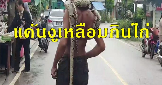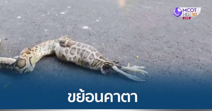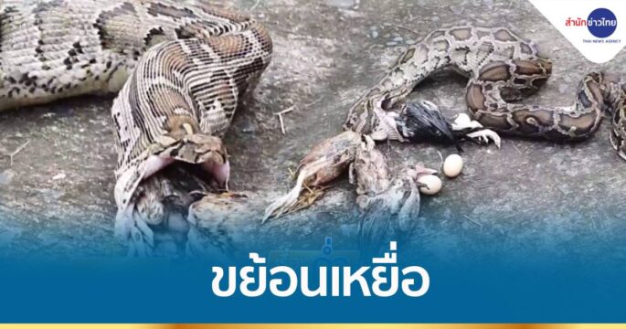 งูเหลือมขนาดใหญ่เขมือบไก่เข้าไปทั้งตัว เลื้อยหนีไม่ได้เพราะติดพุงจนต้องขย้อนเหยื่อออกมา