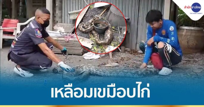 เหลือมตัวใหญ่เขมือบไก่เข้าไป 2 ตัว ไปต่อไม่ไหว นอนพุงป่องอยู่ในเล้า เหลือไก่แค่ตัวเดียวที่รอด เจ้าของโทรแจ้งกู้ภัยมาจับ