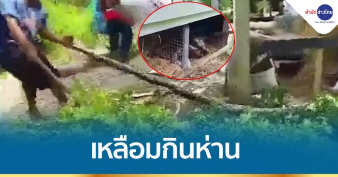 เจ้าของบ้านสุดงง เป็ด-ห่าน หายวันละตัวสองตัว ก่อนเจองูเหลือมเข้ามากินห่านจนอิ่มแปล้ นอนท้องป่องอยู่ใต้เล้า