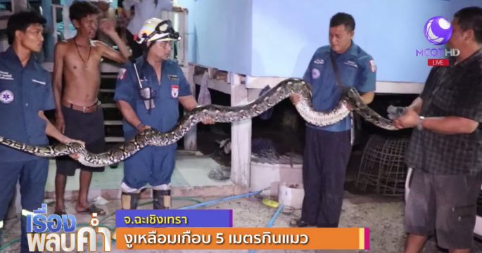 หน่วยกู้ภัยเทศบาลตำบลท่าข้าม จ.ฉะเชิงเทรา จับงูเหลือมยาว 4.50 เมตร ที่เลื้อยเข้ามากินแมวของชาวบ้าน ก่อนปล่อยคืนสู่ธรรมชาติ