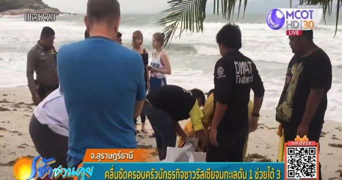คลื่นลมแรงซัด 4 นักท่องเที่ยวชาวรัสเซีย บริเวณชายหาดอ่าวท้องสน ต.บ่อผุด อ.เกาะสมุย จมทะเลเสียชีวิต 1 คน ช่วยได้ 3 คน