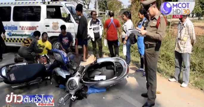 นักศึกษาวัย 25 ขี่รถจักรยานยนต์ชนประสานงารถบรรทุก 6 ล้อขนส่งถังก๊าซแอลพีจี ทำให้เสียชีวิตทันทีในที่เกิดเหตุ