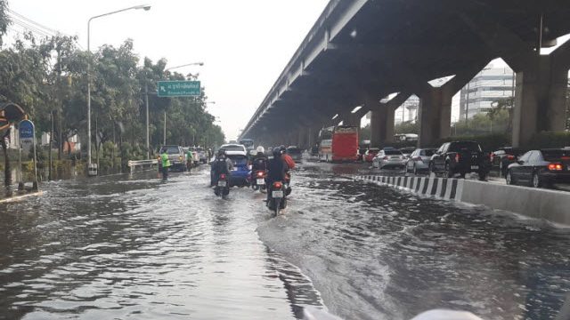 ถนนวิภาวดี-รังสิต จากแยกสุทธิสาร มุ่งใต้ด่วนดินแดง รถมาก ท้ายสะสมหน้าสถานีโทรทัศน์ NBT ขณะที่บางจุดมีน้ำท่วมขังผิวจราจร