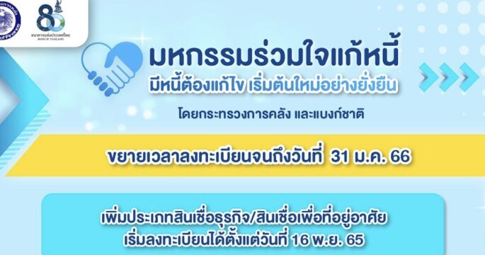 กรุงเทพฯ 19 ม.ค. คลัง ชวนประชาชน ร่วมงานมหกรรมร่วมใจแก้หนี้ “มีหนี้ต้องแก้ไข เริ่มต้นใหม่อย่างยั่งยืน” ณเทศบาลเมืองบ้านสวน จ.ชลบุรี