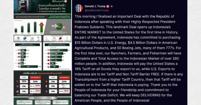 กรุงเทพฯ 16 ก.ค. – บล.กรุงศรี ยังประเมินการเจรจาภาษีสหรัฐ ไทยจะถูกจัดเก็บภาษีไม่ถึง 36% คาด 19-25% หลังดีลอินโดฯ เวียดนาม ภาษีลดลง ด้าน สนค.ติดตามข้อมูลส่งออกไปสหรัฐ โดยไทย-เวียดนาม-อินโดฯ เป็นฐานข้อมูลสำคัญในการเจรจา หลังจากอินโดนีเซียเป็นประเทศที่ 2 ในอาเซียน ที่นายโดนัลด์ ทรัมป์ ประธานาธิบดีสหรัฐ ประกาศว่าเจราจาภาษีสำเร็จ จากที่ก่อนหน้านี้เจรจากับเวียดนามเรียบร้อยไปแล้ว โดยฝ่ายสหรัฐลดภาษีต่างตอบโต้ให้อินโดนีเซียเหลือ 19% จาก 32% ส่วนสหรัฐสามารถส่งออกเข้าตลาดอินโดนีเซียโดยปลอดภาษี ภายใต้ข้อตกลงนี้ อินโดนีเซียจะซื้อสินค้าสหรัฐ ประกอบด้วยพลังงาน 1.5 หมื่นล้านดอลลาร์สหรัฐ, ผลิตภัณฑ์ทางการเกษตร 4.5 พันล้านดอลลาร์ฯ และซื้อเครื่องบินโบอิ้งอีก 50 ลำ โดยมีจำนวนมากที่เป็นโบอิ้ง 777 อย่างไรก็ตาม หากมีสินค้าจากประเทศอื่น ๆ มาสวมสิทธิ์ภาษีของอินโดนีเซีย สหรัฐจะเก็บภาษีบวกเพิ่มตามอัตราที่กำหนดจากประเทศที่สวมสิทธิ์ บวกกับอัตราภาษีที่อินโดนีเซียจะต้องจ่าย ในขณะเดียวกัน โดนัลด์ ทรัมป์ เปิดเผยว่าวางแผนจะเรียกเก็บภาษีนำเข้าสินค้าจากประเทศขนาดเล็ก ซึ่งรวมถึงประเทศในแอฟริกาและแคริบเบียน ในอัตราที่สูงกว่า […]