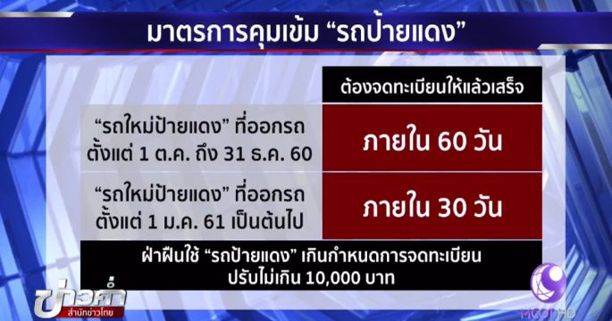 กรมการขนส่งทางบก เตรียมบังคับใช้กฎหมายกับรถป้ายแดงอย่างจริงจัง โดยตั้งวันที่ 1 ตุลาคมเป็นต้นไปจนถึงสิ้นปี หากใช้รถป้ายแดงเกิน 60 วันจะถูกปรับสูงสุดไม่เกิน 10,000 บาท และตั้งแต่ 1 มกราคมปีหน้าจะใช้ได้ไม่เกิน 30 วัน