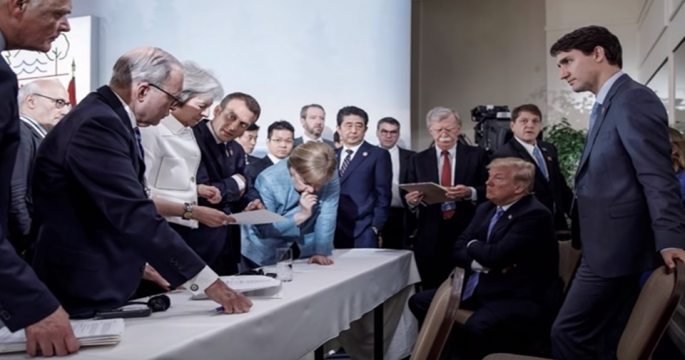 สหรัฐโทษแคนาดา เจ้าภาพการประชุมสุดยอดจี7 ว่าทำให้การประชุมปิดฉากอย่างย่อยยับ เพราะนายกรัฐมนตรีจัสติน ทรูโดของแคนาดาแทงข้างหลังสหรัฐ