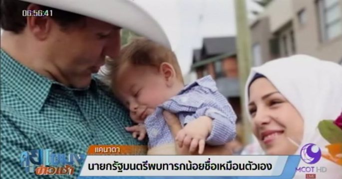 นายจัสติน ทรูโด นายกรัฐมนตรีแคนาดา พบทารกน้อยผู้มีชื่อว่า “จัสติน ทรูโด” เหมือนกัน ที่พ่อแม่ซึ่งเป็นผู้ลี้ภัยชาวซีเรียตั้งให้ เพื่อเป็นการตอบแทนที่ให้พำนักลี้ภัยในแคนาดา