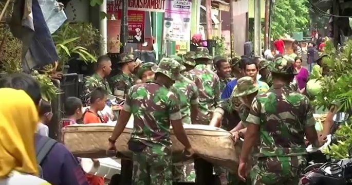 หน่วยช่วยเหลือและกู้ภัยของอินโดนีเซียใช้เฮลิคอปเตอร์หลายลำในการลำเลียงอาหารไปแจกจ่ายให้แก่ชุมชนที่อยู่ห่างไกลที่ได้รับผลกระทบจากเหตุน้ำท่วมใหญ่