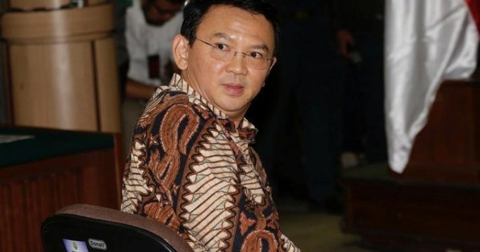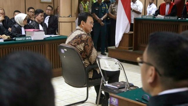นายบาสุกี จาฮาจา ปูร์นามา ผู้ว่าการกรุงจาการ์ตาของอินโดนีเซียหลั่งน้ำตาขณะให้การแก้ต่างในข้อหาดูหมิ่นคัมภีร์อัลกุรอ่านในวันนี้