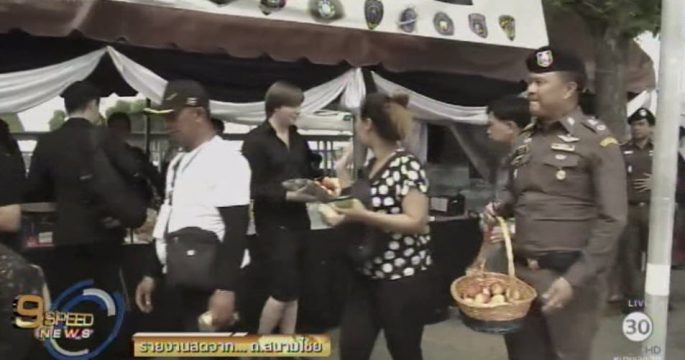 รองนางสาวไทยร่วมเป็นจิตอาสาหน่วยปฐมพยาบาล พร้อมแจกข้าวเหนียวไก่ทอดมูลนิธิอาสาเพื่อนพึ่ง(ภาฯ)ยามยาก สภากาชาดไทยให้ประชาชนที่มารอเข้าถวายสักการะพระบรมศพ