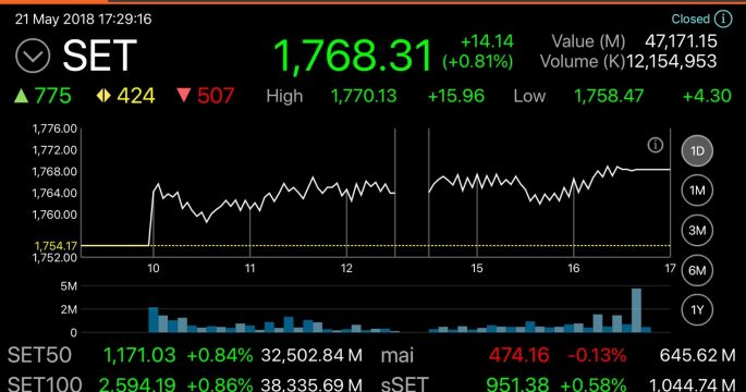 หุ้นบวก 14.14 จุด รับข่าวดีจีดีพีไตรมาสแรกโตเกินคาด ดัชนีปิดที่ 1,768.31 จุด มูลค่าซื้อขายกว่า 47,000 ล้านบาท