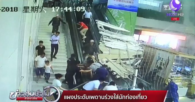 แผงประดับเพดานหลังคา อาคารศูนย์บริการนักท่องเที่ยวภูเขาหัวชาน ในเมืองหัวหยิน มณฑลซานซีทางตะวันตกเฉียงเหนือของจีน ร่วงใส่นักท่องเที่ยวหลายคนที่กำลังใช้บันไดเลื่อนภายในอาคารของศูนย์
