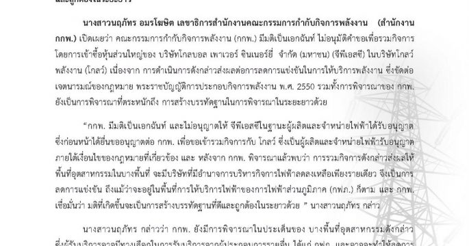 กรุงเทพ ฯ 11 ต.ค. กกพ. ลงมติเอกฉันท์ ห้าม “จีพีเอสซี” ซื้อหุ้น “โกลว์”ระบุ เข้าข่ายลดการแข่งขัน ขัดต่อ พ.ร.บ.การประกอบกิจการพลังงาน 2550 มั่นใจ คำชี้ขาดเอื้อต่อบรรยากาศการลงทุน สร้างบรรทัดฐานที่ดี และถูกต้องในระยะยาว นางสาวนฤภัทร อมรโฆษิต เลขาธิการสำนักงานคณะกรรมการกำกับกิจการพลังงาน (สำนักงาน กกพ.) เปิดเผยว่า คณะกรรมการกำกับกิจการพลังงาน (กกพ.) มีมติเป็นเอกฉันท์ ไม่อนุมัติคำขอเพื่อรวมกิจการ โดยการเข้าซื้อหุ้นส่วนใหญ่ของ บริษัทโกลบอล เพาเวอร์ ซินเนอร์ยี่ จากัด (มหาชน) (จีพีเอสซี) ในบริษัทโกลว์ พลังงาน (โกลว์) เนื่องจาก การดำเนินการดังกล่าวส่งผลต่อการลดการแข่งขันในการให้บริการพลังงาน ซึ่งขัดต่อเจตนารมณ์ของกฎหมาย พระราชบัญญัติการประกอบกิจการพลังงาน พ.ศ. 2550 รวมทั้งการพิจารณาของ กกพ. ยังเป็นการพิจารณาที่ตระหนักถึง การสร้างบรรทัดฐานในการพิจารณาในระยะยาวด้วย “กกพ. มีมติเป็นเอกฉันท์ และไม่อนุญาตให้ จีพีเอสซีในฐานะผู้ผลิตและจำหน่ายไฟฟ้าได้รับอนุญาต ซึ่งก่อนหน้าได้ยื่นขออนุญาตต่อ กกพ. เพื่อขอเข้ารวมกิจการกับ […]