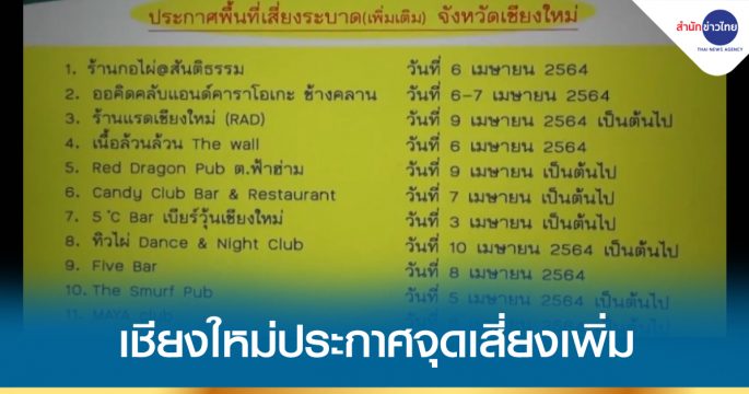 เชียงใหม่ประกาศจุดเสี่ยงเพิ่มอีก 11 แห่ง พร้อมขอให้ผู้ที่ไปสถานที่ดังกล่าว ระหว่างวันที่ 3-10 เม.ย. ตรวจหาเชื้อโควิด-19 โดยด่วน