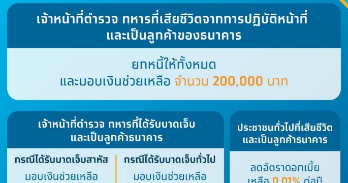 กรุงเทพฯ 10 ก.พ.-ผู้สื่อข่าวรายงานว่า ธนาคารกรุงไทยออกมาตรการช่วยเหลือเร่งด่วนยกหนี้ให้กับเจ้าหน้าที่ตำรวจ ทหาร ที่เสียชีวิตจากการปฏิบัติหน้าที่และเป็นลูกค้าของธนาคาร พร้อมมอบเงินให้กับครอบครัว จำนวน 200,000 บาท รวมทั้งมอบเงินช่วยเหลือ และลดดอกเบี้ยกรณีบาดเจ็บ สำหรับลูกค้าประชาชนทั่วไปที่เสียชีวิต ลดดอกเบี้ยเหลือ 0.01% ต่อปี คงที่เป็นเวลา 5 ปี พร้อมประสานกับบริษัทประกันจ่ายค่าสินไหมทดแทนให้ลูกค้าเร่งด่วน นายผยง ศรีวณิช กรรมการผู้จัดการใหญ่ ธนาคารกรุงไทย เปิดเผยว่า จากเหตุการณ์ร้ายแรงที่โคราช จังหวัดนครราชสีมา ทำให้ประชาชนได้รับบาดเจ็บและเสียชีวิตจำนวนมากธนาคารกรุงไทย ในฐานะธนาคารพาณิชย์ของรัฐ ได้ออกมาตรการช่วยเหลือเป็นกรณีเร่งด่วนเพื่อบรรเทาความเดือดร้อนให้กับครอบครัวของ ลูกค้าที่เสียชีวิตและบาดเจ็บดังนี้ กรณีเสียชีวิต เจ้าหน้าที่ตำรวจ ทหาร ที่เสียชีวิตจากการปฏิบัติหน้าที่และเป็นลูกค้าธนาคาร ธนาคารยกหนี้ให้ทั้งหมด และมอบเงินช่วยเหลือให้กับครอบครัว จำนวน 200,000 บาท 2. กรณีบาดเจ็บ โดยเจ้าหน้าที่ตำรวจ ทหารที่บาดเจ็บสาหัสและเป็นลูกค้าของธนาคาร ธนาคารมอบเงินช่วยเหลือ 50,000 บาท และลดอัตราดอกเบี้ยเหลือ 0.01%ต่อปี คงที่เป็นเวลา5 ปี ,เจ้าหน้าที่ตำรวจ ทหารที่บาดเจ็บทั่วไปและเป็นลูกค้าของธนาคาร ธนาคารมอบเงินช่วยเหลือ 20,000 […]
