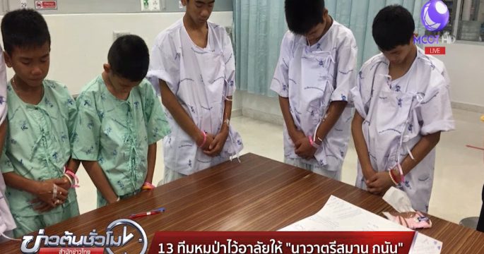 น้องๆ 13 ชีวิตทีมหมูป่าอะคาเดมี ยืนไว้อาลัยและแสดงความเสียใจ หลังทราบเรื่องราวของ นาวาตรีสมาน กุนัน เสียชีวิตจากการปฏิบัติภารกิจในครั้งนี้